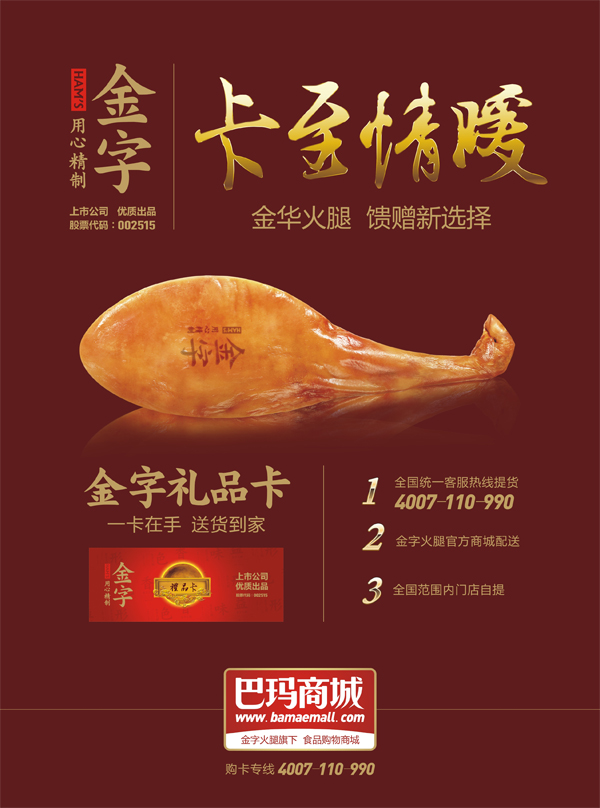 作為一家上市公司——金字火腿推出的禮品卡,禮品卡多年信譽(yù),廣受消費(fèi)者的真心歡迎,每年回頭客無數(shù),而更重要的是,金字每年把產(chǎn)品的品質(zhì)和備貨做到更好,禮品卡內(nèi)產(chǎn)品都是公司層層品質(zhì)歷練的熱銷產(chǎn)品,用火腿、臘肉、香腸這些實(shí)在心意,去感動每一位朋友。如今,更是可以通過手機(jī)微信關(guān)注金字火腿,盡享中華美食同時(shí),與朋友分享禮品卡里所蘊(yùn)含的真情實(shí)意。